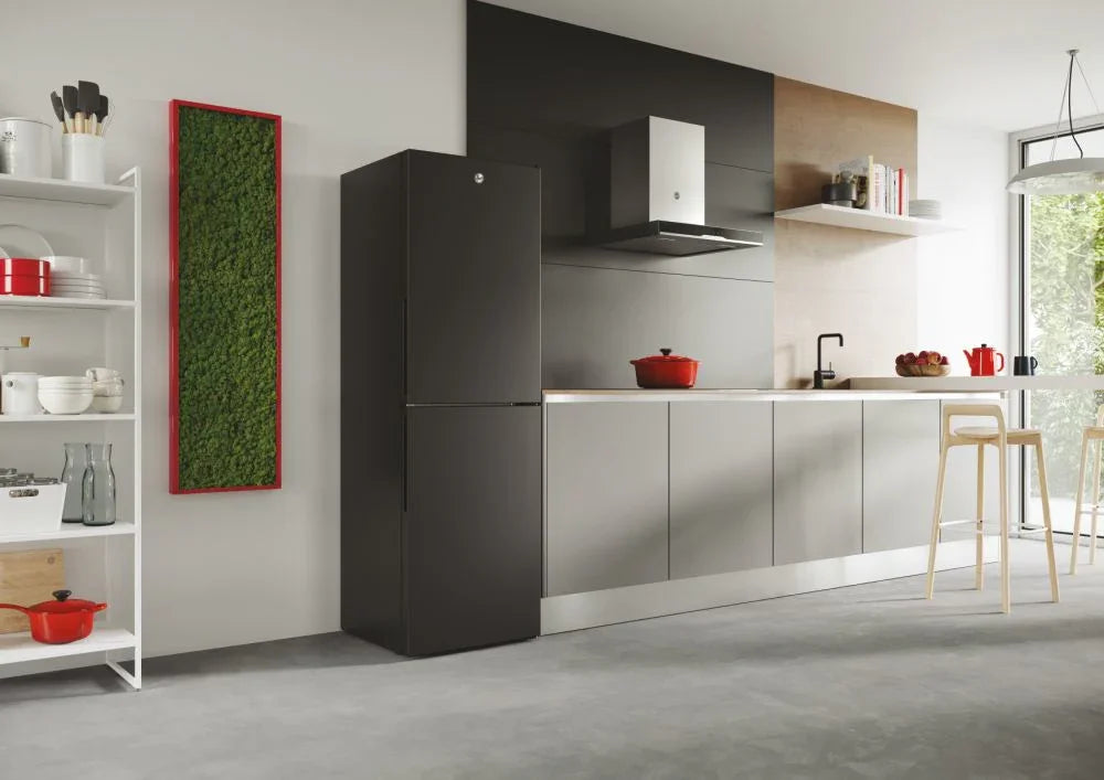 Hoover H-FRIDGE 300 HVT3CLECKIHB-1. Total net capacity: 252 L. Door hinge: Right. Climate class: N-ST, Noise level: 39 dB. Fridge net capacity: 151 L, Fridge interior light, Fridge number of shelves/baskets: 3, Number of vegetable drawers: 1. Freezer net capacity: 101 L, Freezing capacity: 4.5 kg/24h. Fresh zone compartment. Energy efficiency class: E, Annual energy consumption: 218 kWh. Product colour: Black