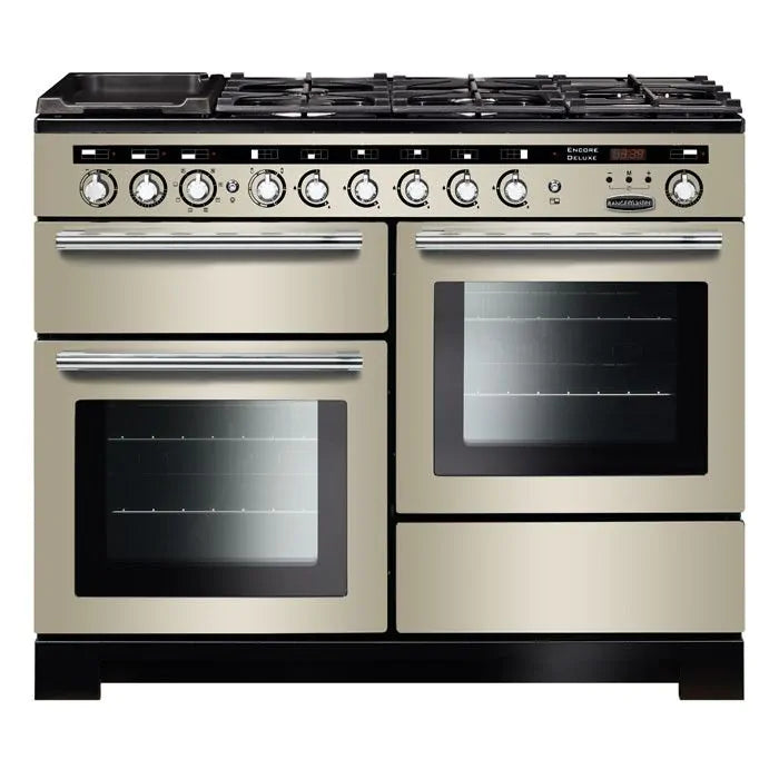 The Rangemaster Encore Deluxe 110cm Dual Fuel Range Cooker in Ivory with Chrome trim offers a perfect blend of style and professional-level cooking performance. With a spacious gas hob and dual multifunction electric ovens, this cooker provides versatility, precision, and elegance for large family meals or entertaining.
