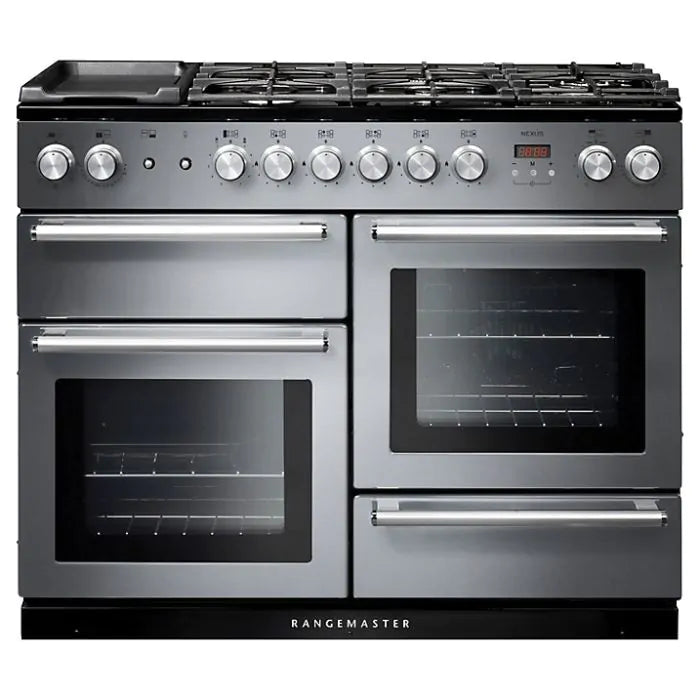 The Rangemaster Nexus 110cm Dual Fuel Range Cooker in Stainless Steel with Chrome trim combines modern aesthetics with professional-level cooking performance. Featuring a large gas hob and dual multifunction electric ovens, this cooker offers precision, versatility, and a stylish focal point for contemporary kitchens.